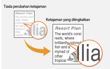 | | Anda boleh melaraskan ketajaman imej. Tingkatkan ketajaman bagi menajamkan teks dan garisan yang kabur atau kurangkan ketajaman bagi memperbaik penampilan foto majalah. Melaras Ketajaman |