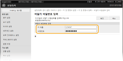 2 | 키 이름과 비밀번호를 입력합니다. [키 이름] 등록할 키의 이름으로 영숫자 문자를 입력합니다. [비밀번호] 등록할 파일에 대해 설정할 개인 키의 암호로 영숫자 문자를 입력합니다. |