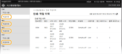 부서 ID 관리 설정에 관계없이 현재 인쇄 중이거나 인쇄 대기 중인 모든 인쇄 문서가 나열됩니다. 일반 사용자 모드로 로그인할 때 사용자 이름을 입력한 경우 인쇄한 문서에만 사용자 이름이 표시됩니다. 일시 중지된 문서 및 보안 문서에서 [접수번호]를 클릭하여 세부 정보를 표시합니다. 인쇄된 문서의 사용자 이름 및 페이지 카운트를 확인할 수 있습니다. |