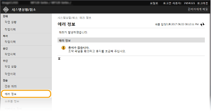 오류가 발생한 경우 포털 페이지(메인 페이지)에서 [에러 정보] 아래 표시된 메시지를 클릭하면 이 페이지가 표시됩니다.