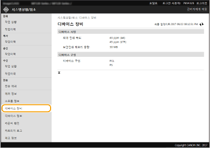 기기 및 시스템 관리자 정보가 표시됩니다. 여기에 표시된 장치 이름 및 기타 시스템 관리자 정보는 [사용자 관리] 페이지의 [시스템 관리자 정보] 또는 [디바이스 관리] 페이지의 [디바이스 정보 설정] 설정과 일치합니다.