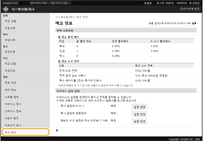 월별 총 인쇄물 용량과 월별 전력 소비가 표시됩니다. 에코 정보 화면을 표시하고 용지와 전력 소비를 절약하도록 설정을 변경할 수 있습니다.