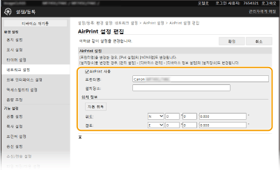 기기 이름, 설치장소 등 AirPrint 설정에 입력된 값을 확인할 수 있습니다. 설정을 변경하려면 [편집]을 클릭합니다.