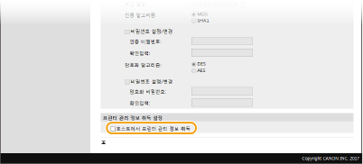 비밀번호를 설정하거나 변경하려면, 확인란을 선택하고 [인증 비밀번호] 또는 [암호화 비밀번호] 텍스트 상자에 영숫자 문자를 입력합니다. 비밀번호 확인을 위해 [확인입력] 텍스트 상자에 똑같이 입력합니다. 인증과 암호화 알고리즘에 비밀번호를 각기 별도로 설정할 수 있습니다.