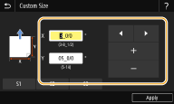 2 | Specify the length of the <X> side and <Y> side. Select <X> or <Y>, and enter the length of each side using <+>/<->, with / to move the cursor between the digits for inputting whole numbers and fractions.![]() ![]() If you register the paper size you use frequently on buttons <S1> to <S3>, you can call them up with one touch. Registering a Custom Paper Size |