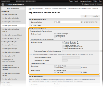 O seletor define as condições para pacotes IP aplicarem a comunicação IPSec. Condições selecionáveis incluem endereço IP e números de porta da máquina e os dispositivos com os quais se comunicar.