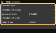 Affiche les réglages réseau tels que l'adresse IP de l'appareil et l'état (condition des communications réseau local sans fil, par exemple).