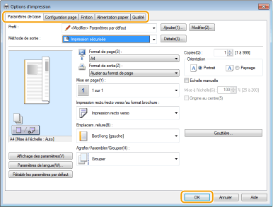 Faites les réglages nécessaires pour l'impression et cliquez sur [OK].