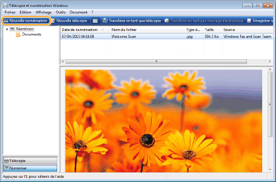 Quand la numérisation est achevée, le document numérisé s'affiche dans la liste de fichiers sur l'écran [Télécopie et numérisation Windows] et est enregistré dans le dossier [Documents numérisés] de [Documents].