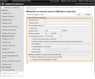 Les serveurs LDAP doivent être enregistrés séparément soit pour la recherche soit pour l'authentification. Pour utiliser un serveur pour la recherche de destinataire de fax et d'e-mails, enregistrez-le pour la recherche, et pour l'utiliser pour l'authentification pour l'envoi d'e-mail ou de fax, enregistrez-le pour l'authentification.