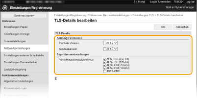 Geben Sie [Höchste Version] und [Mindestversion] von TLS an.
