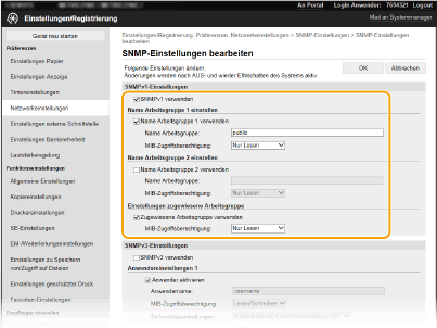 Deaktivieren von SNMPv1Wenn Sie SNMPv1 deaktivieren, stehen einige der Funktionen des Geräts nicht mehr zur Verfügung, so auch das Abrufen von Geräteinformationen über den Druckertreiber. Verwenden des Bedienfelds |