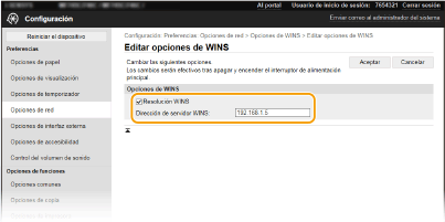Para poder especificar la configuración del servidor WINS, debe indicar el nombre de NetBIOS y el nombre del grupo de trabajo. Configuración de SMBLa función no está disponible en las redes IPv6.