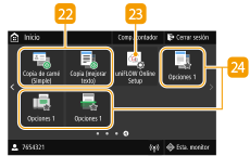 La pantalla Inicio se muestra cuando se enciende el equipo o se pulsa en el panel de control. Utilice esta pantalla para especificar la configuración y registrar funciones.