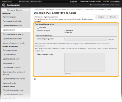 Cuando se selecciona [Rechazar] para un filtro de salida Los paquetes de difusión y multidifusión de salida no pueden filtrarse. Eliminación de una dirección IP de las direcciones excluidas Seleccione una dirección IP y haga clic en [Eliminar]. ![]() | ||||||||||||||
