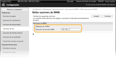 Para poder especificar la configuración del servidor WINS, debe indicar el nombre de NetBIOS y el nombre del grupo de trabajo. Configuración de SMBLa función no está disponible en las redes IPv6.