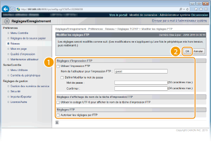 Utilisation du panneau de commandeVous pouvez aussi activer ou désactiver l'impression FTP et les réglages FTP depuis le menu des réglages du panneau de commande. FTP |