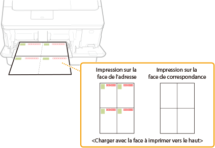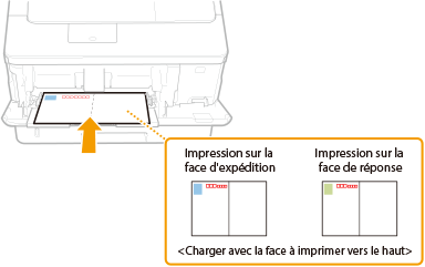 Insérez la carte postale la face à imprimer vers le dessus et le bord court vers l'appareil pour les cartes normales et 4 sur 1 ou le bord long vers l'appareil pour les cartes réponses.