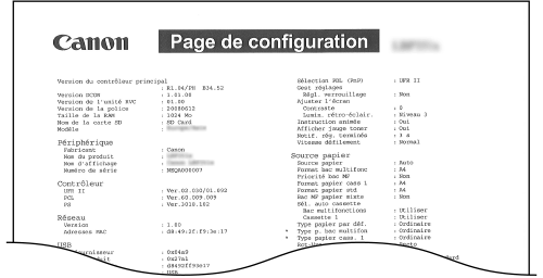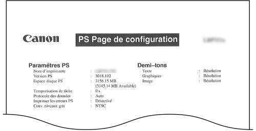 Les réglages pour l'utilisation du mode PS et les éléments d'information internes enregistrés dans l'appareil sont imprimés sous forme de liste.