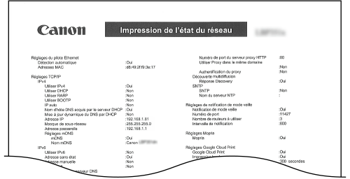 Réseau) sous forme de liste. Les informations sur la sécurité comprenant, entre autres, les réglages de filtrage d'adresses et les réglages IPSec sont également imprimés.