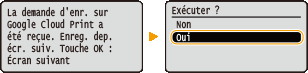 Enregistrement depuis un périphérique mobile ou Google ChromeVous pouvez également enregistrer l'appareil depuis un terminal mobile ou Google Chrome. L'écran de l'appareil affiche l'écran de confirmation ci-après avant la fin de l'enregistrement. Sélectionnez  <Oui>  pour terminer l'enregistrement. Pour faire l'enregistrement, il faut afficher l'écran principal. Appuyez sur  (  ) pour afficher l'écran principal et effectuez l'enregistrement. Pour la procédure d'enregistrement, consultez le mode d'emploi de votre périphérique mobile ou le site Web de Google Cloud Print. |