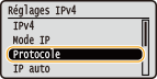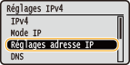 Sélectionnez <Réglages TCP/IP>  <Réglages IPv4>  <Mode IP>.