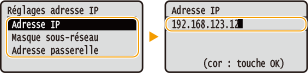 Sélectionnez <Réglages adresse IP> et appuyez sur .