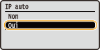 Vous ne pouvez utiliser qu'un seul de ces protocoles : DHCP, BOOTP ou RARP. Si le protocole sélectionné est réglé sur <Oui>, les deux autres sont automatiquement réglés sur <Non>.