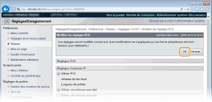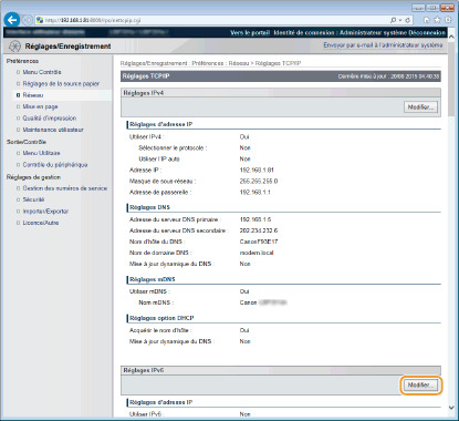 Configuration des réglages DNS IPv61 | Cliquez sur [Modifier] dans [Réglages IPv6]. ![]() |