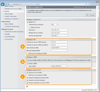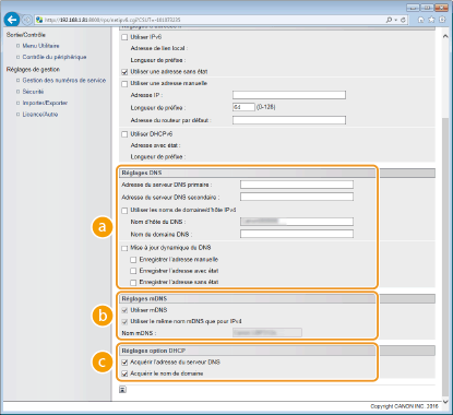 2 | Configurez les réglages DNS IPv4. ![]() [Réglages DNS][Adresse du serveur DNS primaire ] Saisissez l'adresse IP d'un serveur DNS. Vous pouvez aussi définir l'adresse IP depuis le panneau de commande (Réglages IPv4). [Adresse du serveur DNS secondaire ] Le cas échéant, saisissez l'adresse IP d'un serveur DNS secondaire. Vous pouvez aussi définir l'adresse IP depuis le panneau de commande (Réglages IPv4). [Nom d'hôte du DNS] Saisissez le nom d'hôte de l'appareil (en caractères alphanumériques) qui est enregistré sur le serveur DNS. [Nom de domaine DNS] Saisissez le nom de domaine (en caractères alphanumériques) auquel l'appareil appartient, tel que "exemple.com." [Mise à jour dynamique du DNS] Cochez cette case pour mettre à jour de façon dynamique les enregistrements DNS dès qu'une adresse IP de l'appareil change. [Réglages mDNS][Utiliser mDNS] Adopté par Bonjour, le protocole mDNS (multicast DNS) est un protocole associant le nom d'hôte à une adresse IP sans faire intervenir le DNS. Cochez la case pour activer mDNS et saisissez le nom mDNS dans la zone de texte [Nom mDNS]. Vous ne pouvez cocher cette case que si la case [Utiliser IPv4 ] est cochée. [Réglages option DHCP][Acquérir le nom d'hôte] Cochez cette case pour activer Option 12 afin d'obtenir le nom d'hôte à partir du serveur DHCP. Vous pouvez également spécifier s'il faut obtenir un nom d'hôte depuis le panneau de commande (Réglages IPv4). [Mise à jour dynamique du DNS] Cochez cette case pour activer Option 81 afin de mettre à jour de façon dynamique les enregistrements DNS par le biais du serveur DHCP. Vous pouvez également spécifier s'il faut utiliser la mise à jour dynamique des enregistrements DNS depuis le panneau de commande (Réglages IPv4). [Acquire DNS Server Address] Cochez la case pour activer Option 6 afin d'obtenir une adresse de serveur DNS auprès du serveur DHCP. [Acquire Domain Name] Cochez la case pour activer Option 15 afin d'obtenir un nom de domaine auprès du serveur DHCP. [Acquire WINS Server Address] Cochez la case pour activer Option 44 afin d'obtenir une adresse de serveur WINS auprès du serveur DHCP. |