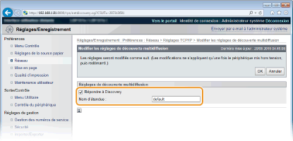 2 | Cochez la case [Répondre à Discovery] et définissez les réglages requis. ![]() [Répondre à Discovery] Cochez cette case pour configurer l'appareil de sorte qu'il réponde aux paquets de découverte de multidiffusion et activer la surveillance par le logiciel de gestion des périphériques. Si vous ne voulez pas que l'appareil réponde, décochez la case. [Nom d'étendue ] Pour inclure l'appareil dans une étendue donnée, entrez un nom d'étendue en caractères. |