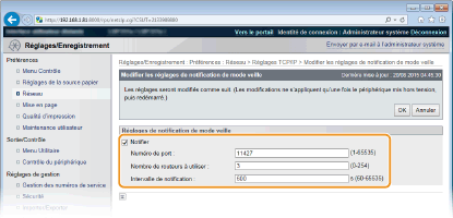 2 | Cochez la case [Notifier] et définissez les réglages requis. ![]() [Notifier] Cochez la case pour signaler au logiciel de gestion des périphériques l'état de l'alimentation de l'appareil. Si [Notifier] est coché, vous constaterez que l'appareil n'établit pas de communications inutiles en mode veille et réduit sa consommation électrique totale. [Numéro de port] Changez le numéro de port pour cette fonction selon l'environnement réseau. [Nombre de routeurs à utiliser] Indiquez le nombre de routeurs que les paquets de notification peuvent traverser. [Intervalle de notification] Indiquez la fréquence à laquelle l'appareil mentionne sa mise sous/hors tension au logiciel de gestion de périphériques. |