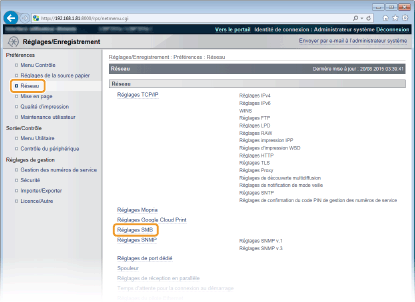 Utilisation du panneau de commandeVous pouvez aussi activer ou désactiver le serveur SMB depuis le menu des réglages du panneau de commande. SMBVous pouvez aussi activer ou désactiver l'impression SMB depuis le menu des réglages du panneau de commande. SMB |