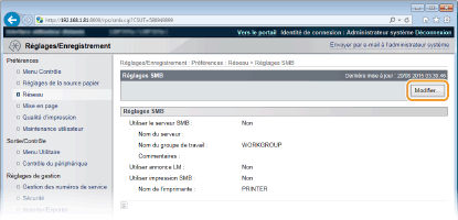 SMB prend uniquement en charge NetBIOS sur TCP/IP et ne prend pas en charge NetBEUI. Configurez l'adresse IP avant de configurer les réglages SMB. Définition des adresses IPSMB n'est activé que si la carte SD en option est installée dans l'appareil. |
