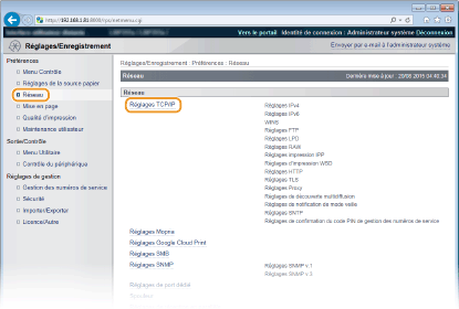 Un nom de groupe de travail spécifié dans [Nom du groupe de travail] sous [Réglages SMB] est automatiquement utilisé pour le [Nom du groupe de travail SMB], le cas échéant. Un changement de nom de groupe de travail dans [Nom du groupe de travail SMB] est aussi appliqué au [Nom du groupe de travail] sous [Réglages SMB].
