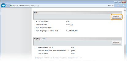 Si vous obtenez l'adresse IP du serveur WINS auprès d'un serveur DHCP, cette adresse IP remplace l'adresse IP saisie dans la zone de texte [Adresse du serveur WINS].