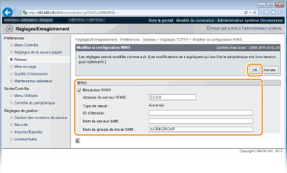 Cochez la case [Résolution WINS], configurez les réglages appropriés et cliquez sur [OK].