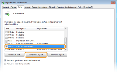 1 | Sélectionnez le numéro de port à supprimer et cliquez sur [Supprimer le port]. ![]() ![]() Vous ne pouvez pas supprimer un port configuré en tant que port de l'imprimante. Pour supprimer ce port, sélectionnez un autre port et cliquez sur [Appliquer] pour le configurer en tant que nouveau port de l'imprimante, puis supprimez le port d'origine. |