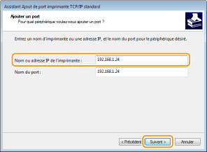 4 | Saisissez l'adresse IP ou le nom DNS de l'appareil, puis cliquez sur [Suivant]. Le champ [Nom du port] est renseigné automatiquement. Au besoin, vous pouvez le modifier. ![]() ![]() Lorsque l'écran suivant s'affiche, suivez les instructions. ![]() *Lorsque vous sélectionnez le [Type de périphérique], sélectionnez [Canon Network Printing Device with P9100] sous [Standard]. |
