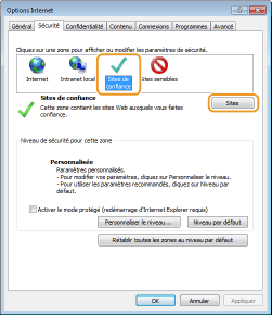 Sélectionnez [Sites de confiance] dans l'onglet [Sécurité], puis cliquez sur [Sites].
