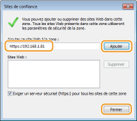 Vérifiez que "https://<adresse IP de l'appareil> ou <nom d'hôte de l'appareil>.<nom de domaine>/" est affiché, puis cliquez sur [Ajouter]