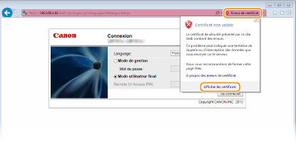 Saisissez "https://<adresse IP de l'appareil>/" dans la barre d'adresse, puis appuyez sur la touche [ENTRÉE].