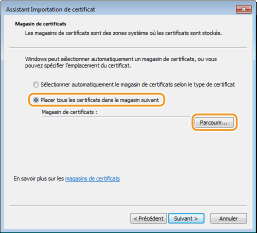 Sélectionnez [Placer tous les certificats dans le magasin suivant] et cliquez sur [Parcourir].