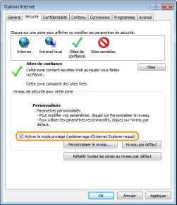 Décochez la case [Activer le mode protégé (redémarrage d'Internet Explorer requis)] si elle est cochée.