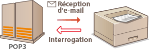 L'impression d'e-mail permet d'imprimer le message et les fichiers image joints d'un e-mail réceptionné depuis le serveur de messagerie POP3 sans utiliser un ordinateur. Les e-mails peuvent être réceptionnés manuellement ou réceptionnés automatiquement à intervalles réguliers. Lorsque le protocole SMTP est utilisé, les e-mails envoyés directement à l'appareil sans passer par un serveur de messagerie sont imprimés.