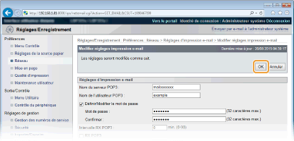 Spécifiez un intervalle en minutes pour la connexion automatique au serveur de messagerie. Les nouveaux e-mails dans la boîte aux lettres du serveur de messagerie sont automatiquement réceptionnés et imprimés aux intervalles programmés. Vous pouvez également spécifier ce réglage à l'aide de <Intervalle RX POP3> dans le menu des réglages du panneau de commande (