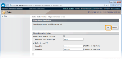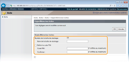 Pour définir un code PIN, cochez la case [Définir le code PIN] et saisissez un numéro dans la zone de texte [Code PIN]. Pour confirmation, saisissez le même numéro dans la zone de texte [Confirmer].