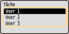 Si les documents sécurisés de deux ou plusieurs utilisateurs sont stockés sur la carte SD, l'écran de sélection d'utilisateurs illustré ci-dessous s'affiche avant l'écran illustré ci-dessus. Sélectionnez votre nom d'utilisateur et appuyez sur