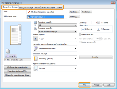 Faites les réglages nécessaires pour l'impression et cliquez sur [OK].