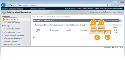 Vous pouvez vérifier l'état de l'impression (en cours d'impression ou en attente d'impression) des documents désignés pour être imprimés depuis un ordinateur et supprimer ou interrompre les documents.